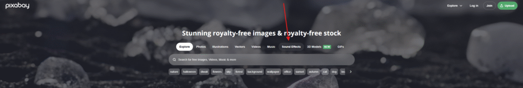 اول از همه طبق تصویر میتونید داخل صفحه اول دسته بندی رو روی sound effect قرار بدید , بعد به راحتی میتونید ساند افکت مورد نظرتون رو سرچ کنید و اون رو پیدا کنید .