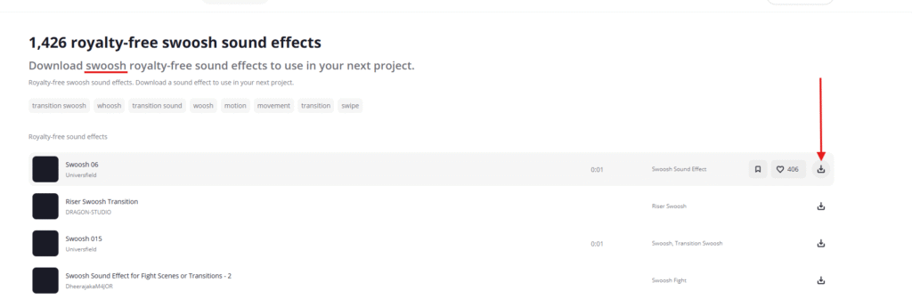 به طور مثال من اگه دنبال ساند افکت swoosh یا همون ووش باشم , توی قسمت سرچ مینویسم swoosh